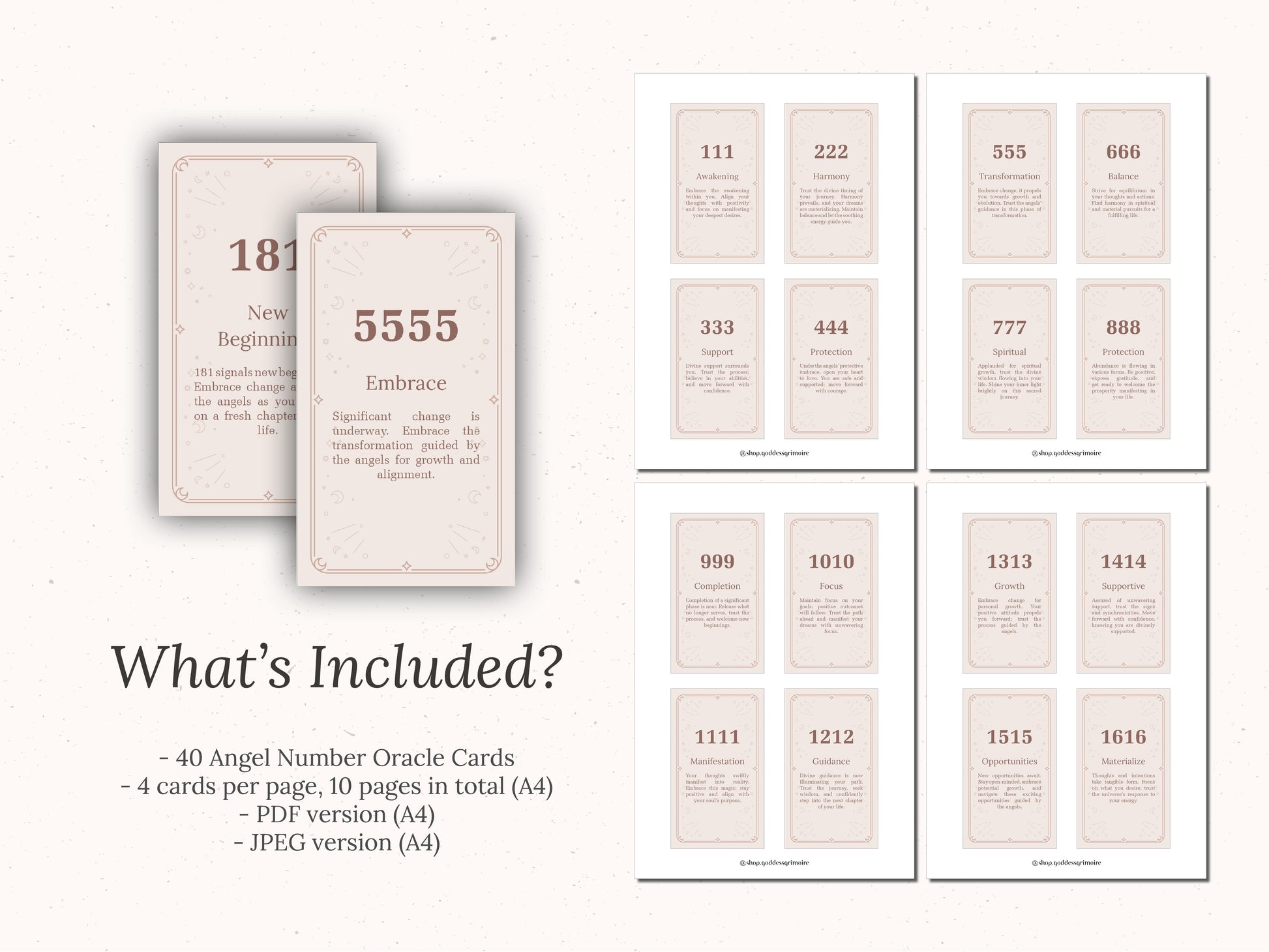 Perfect for personal divination, meditation, or reflection, this digital card set allows you to print the cards as many times as you like, offering endless opportunities to connect with the guidance of the angels. Whether you're new to angel numbers or an experienced practitioner, these cards will serve as a valuable tool in your spiritual practice, helping you receive messages from the divine and gain deeper insights.