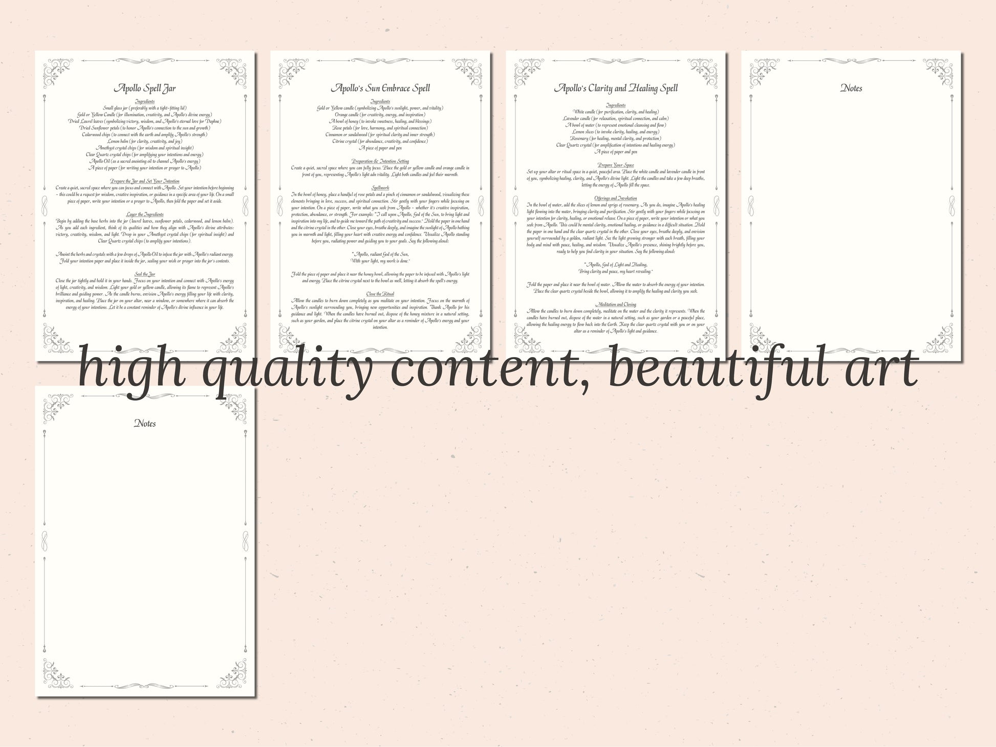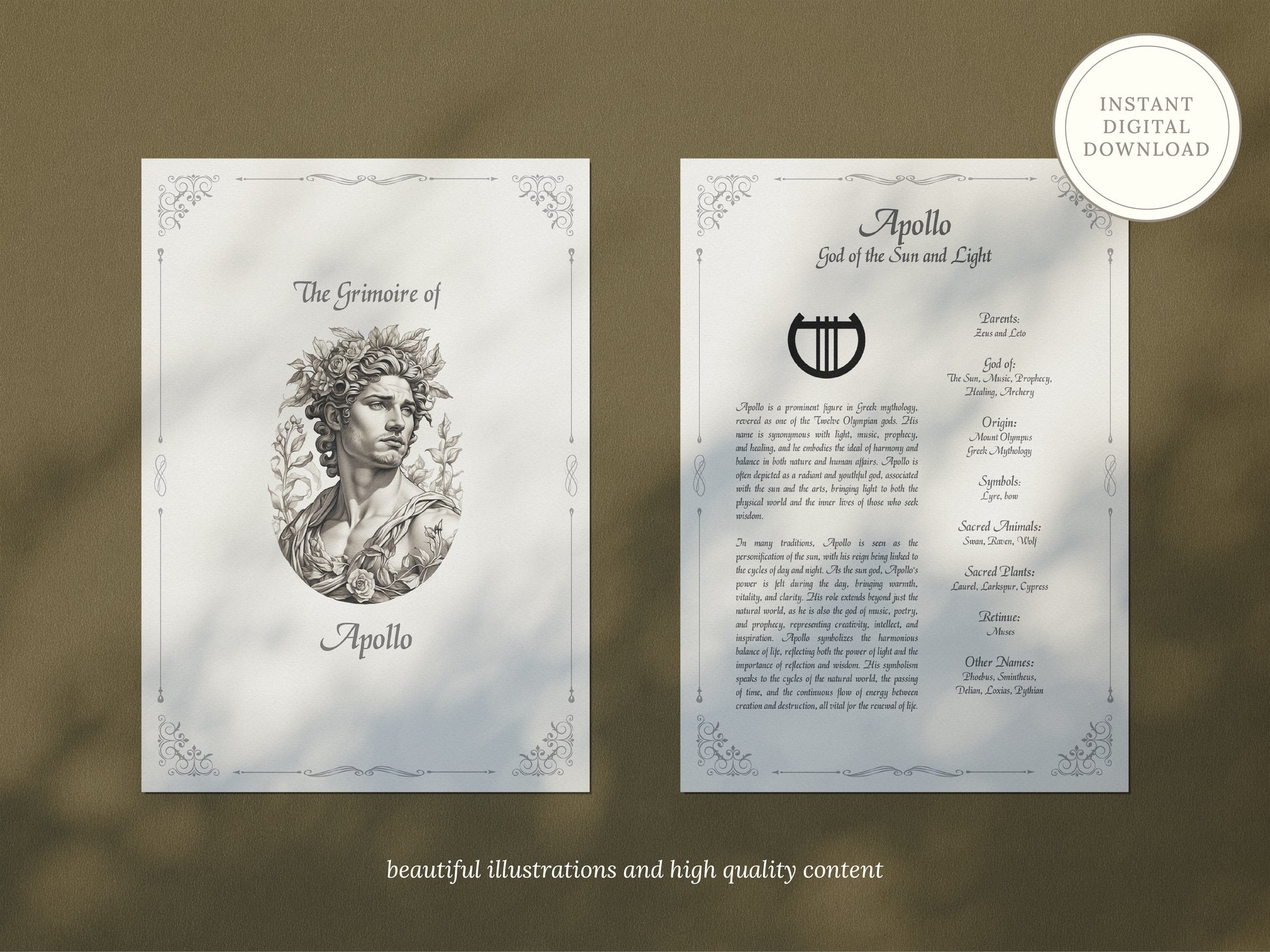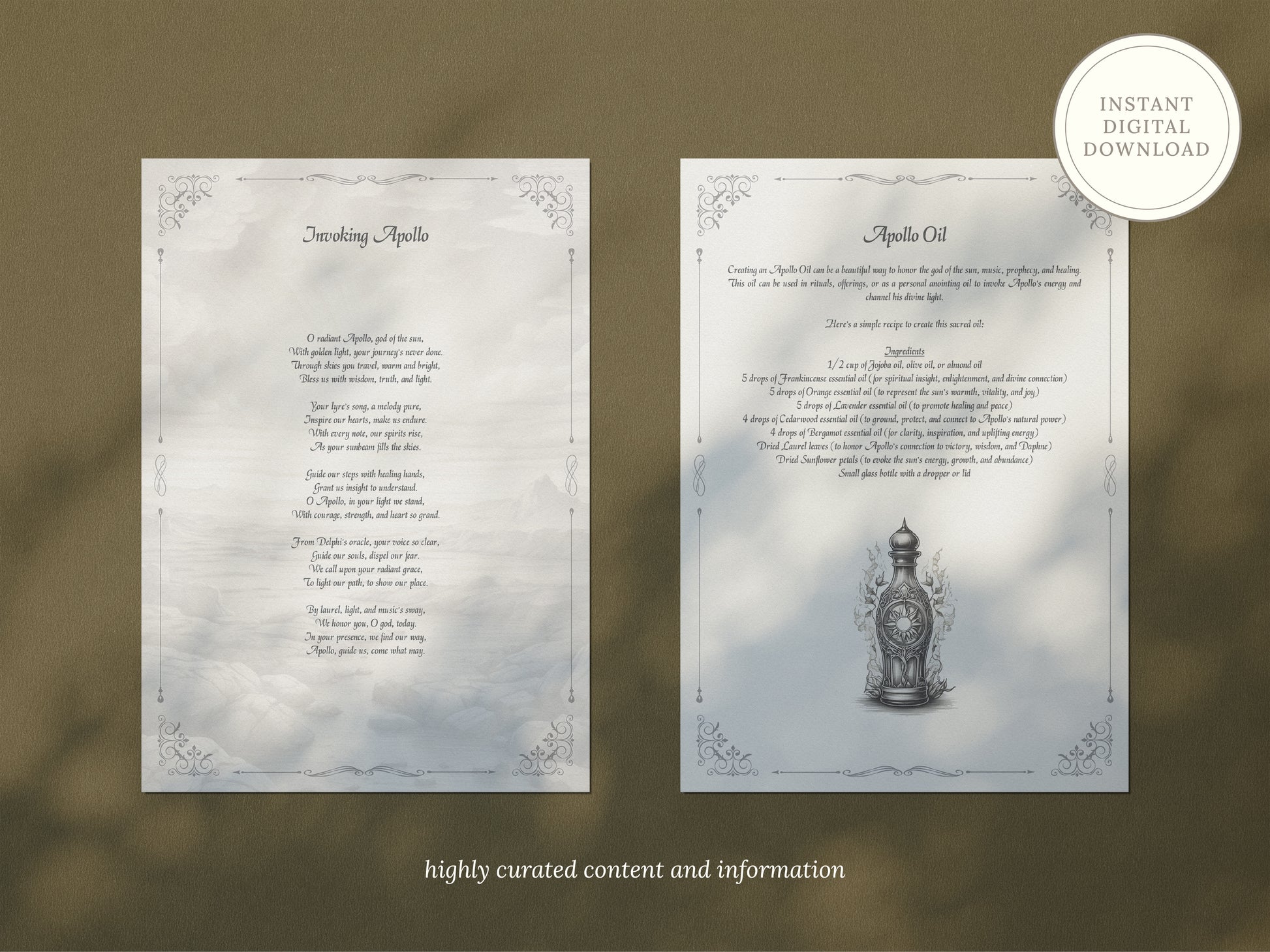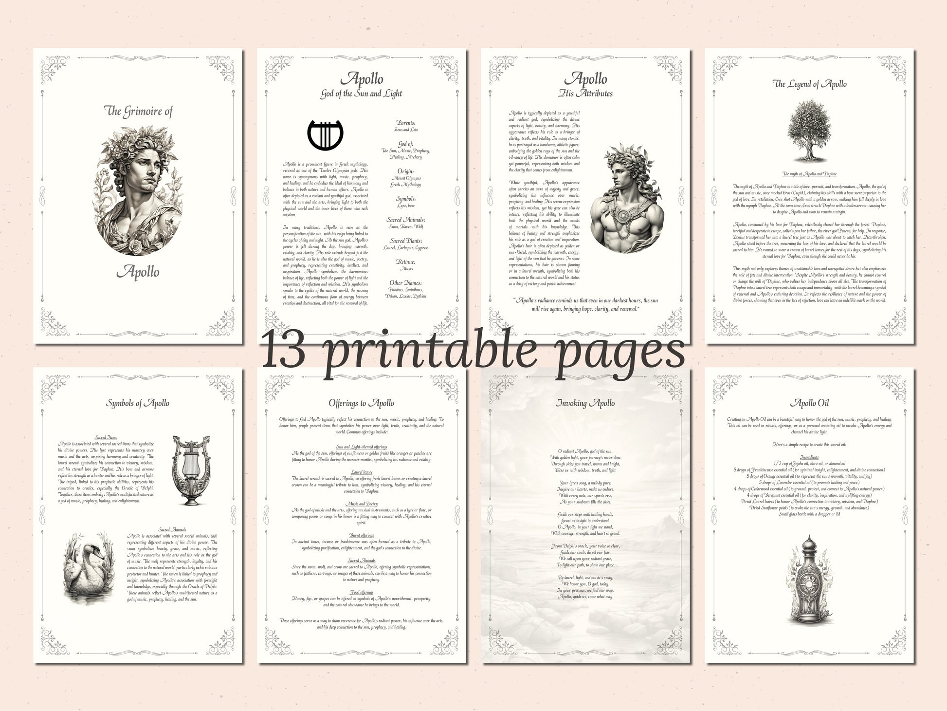 Invoke the radiant power of Apollo, the Greek god of the Sun, healing, and prophecy, with our Digital Apollo Grimoire Pages. This printable collection features rituals, symbols, and sacred knowledge to help you connect with Apollo's energy for clarity, creativity, and guidance. Perfect for enhancing your spiritual practice, these pages are a powerful addition to your grimoire, helping you harness Apollo's divine light and transformative strength.