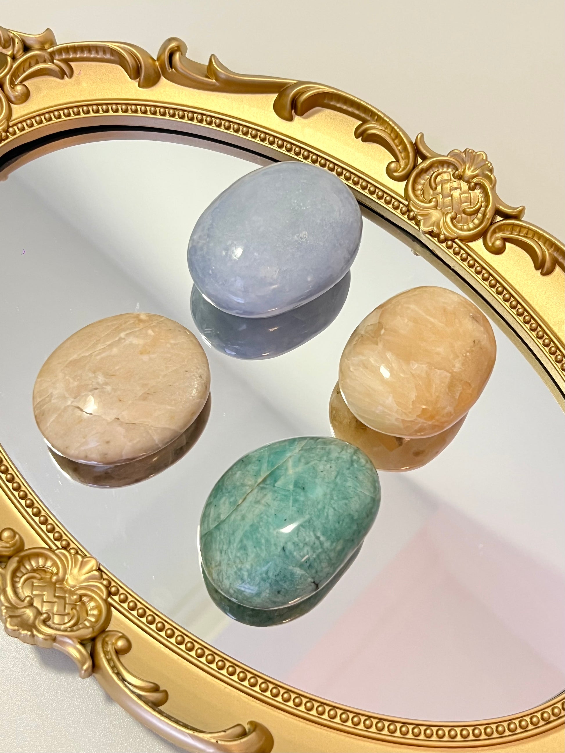Crystal Palm Stones are smooth, polished pieces that fit gently in the hand, making them ideal for meditation, energy work, or moments of calm throughout the day. Their shape allows for a direct connection with the body's energy field, helping to ground, soothe, and harmonize the spirit. Use them during breath work, carry them as pocket companions, or place them over the chakras to align and restore balance.