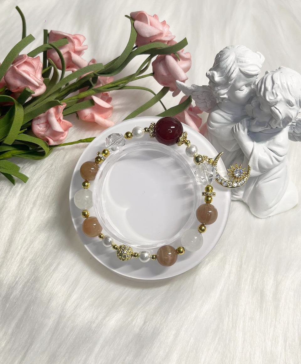 Crystals: Carnelian, Clear Quartz, Peach Moonstone, Pearl