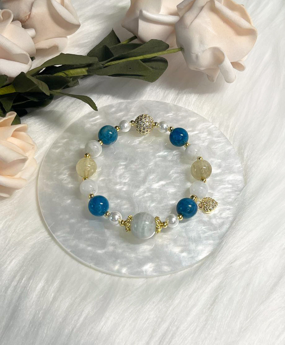 Enhance your spiritual journey with this meticulously crafted bracelet, featuring a unique combination of Grey Moonstone, Blue Apatite, Rainbow Moonstone, Citrine, and Pearl. Each gemstone is thoughtfully selected for its distinct metaphysical properties, working synergistically to bring balance, clarity, and positivity into your life.