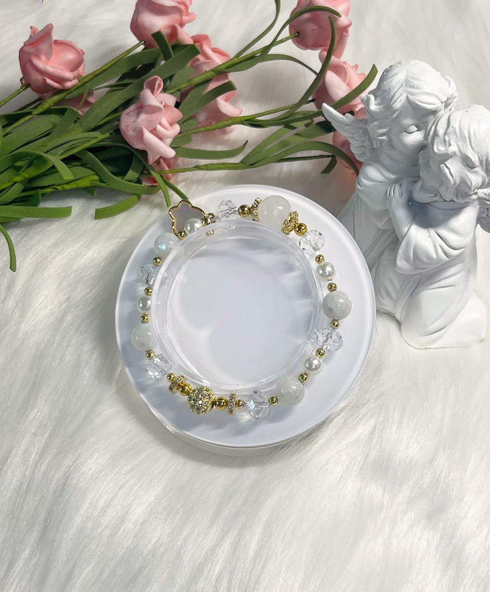 *Instock* Crystal Bracelet - White Jade, Clear Quartz, Rainbow Moonstone, Pearl - Gold - Size 14cm