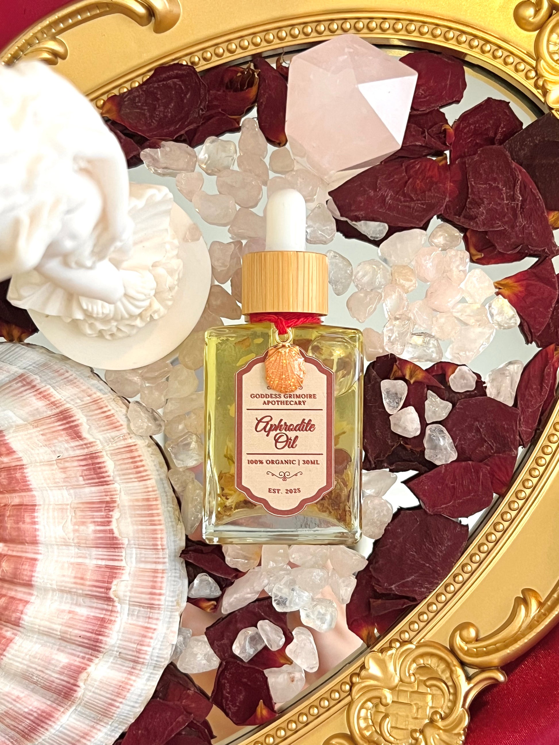 A sacred blend to honor and invoke Aphrodite, the goddess of love, beauty, desire, and divine femininity. This oil is ritually crafted to awaken sensuality, enhance self-love, attract romance, and inspire heart-healing through her radiant essence. Blended under Venus-aligned timing and charged with love-drenched intention, each bottle is a vessel of her enchantment and grace.