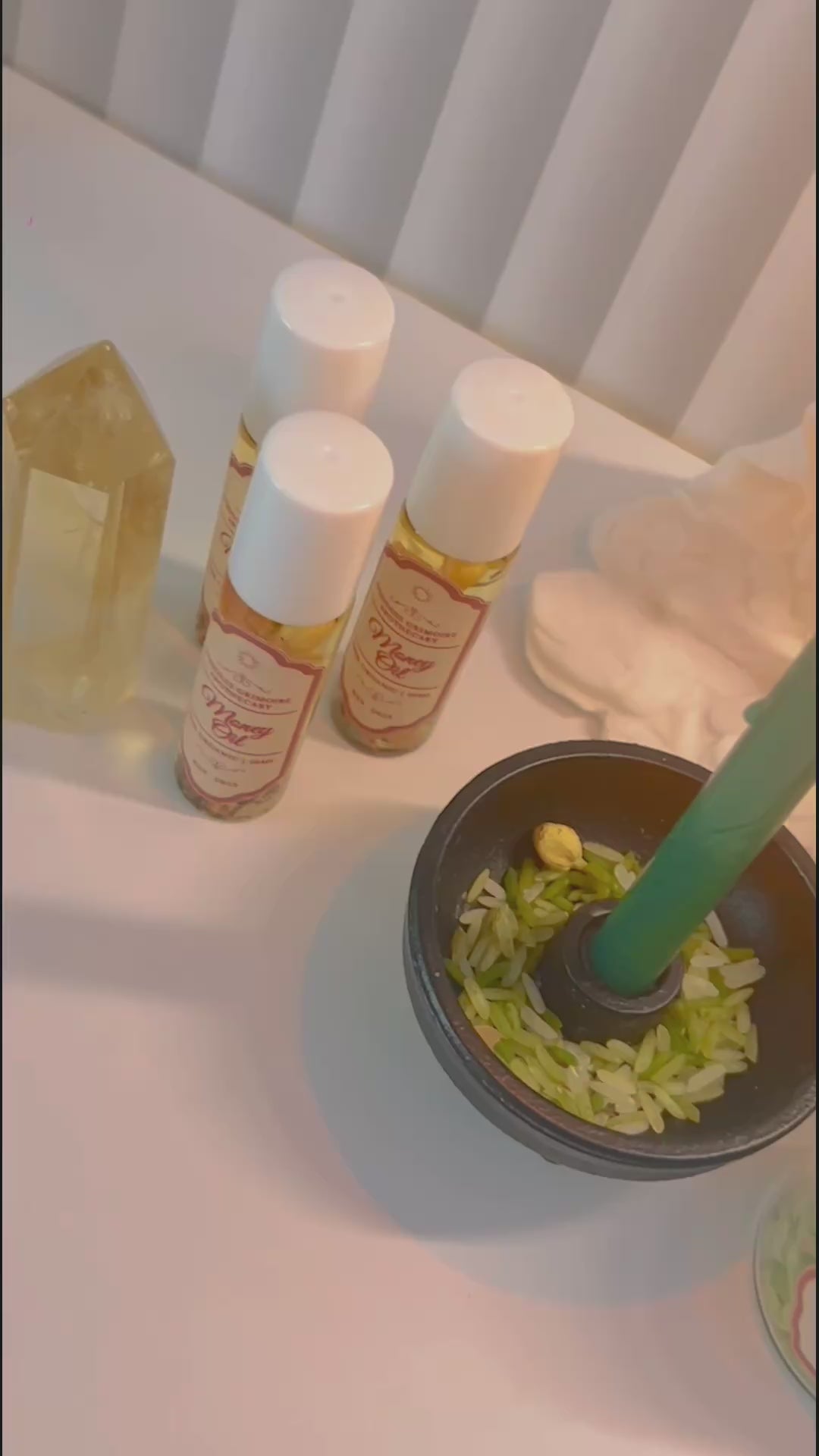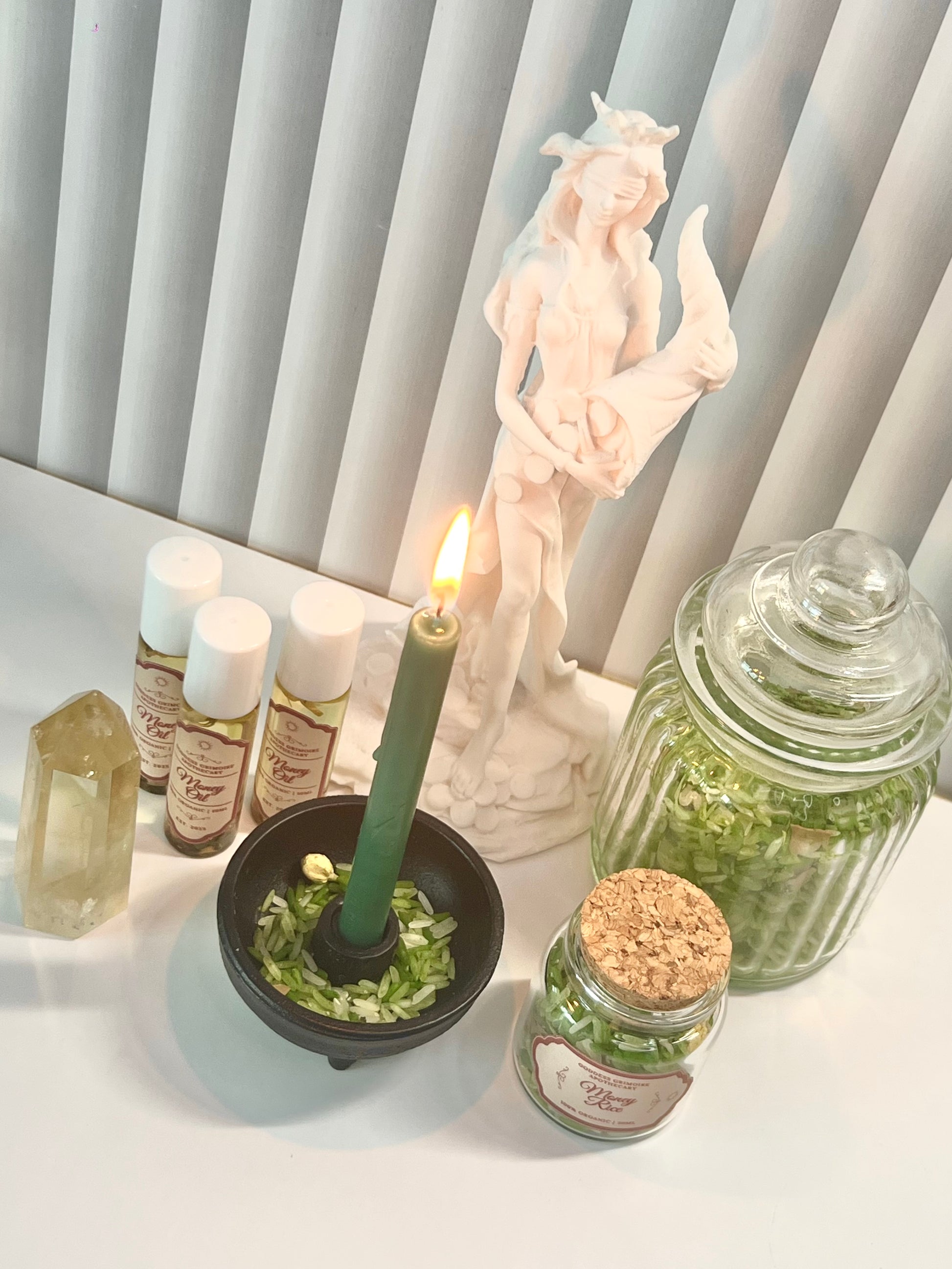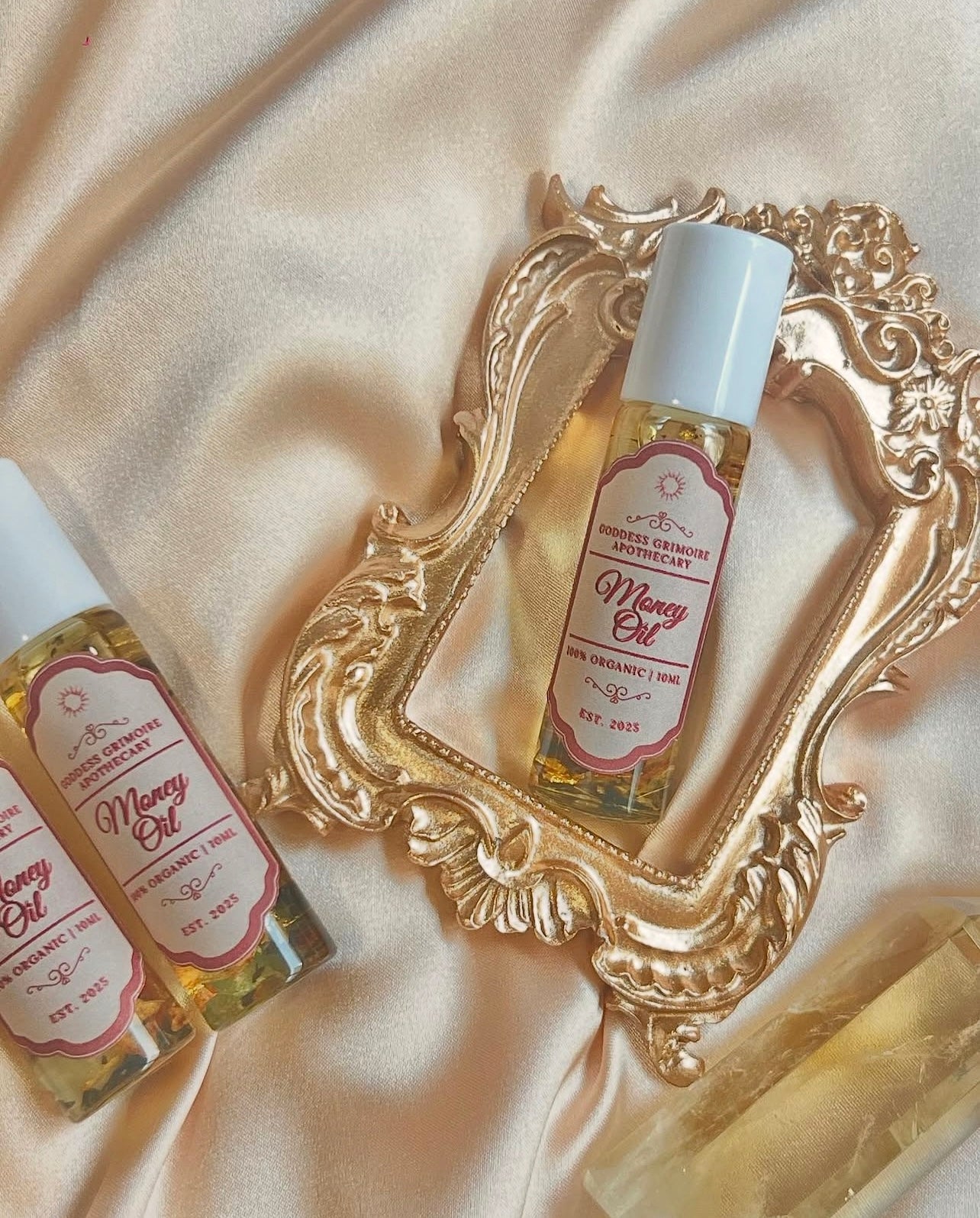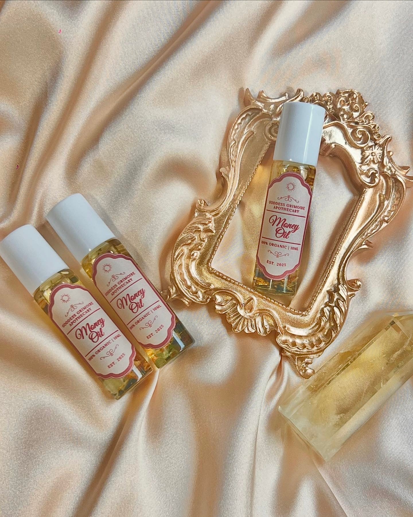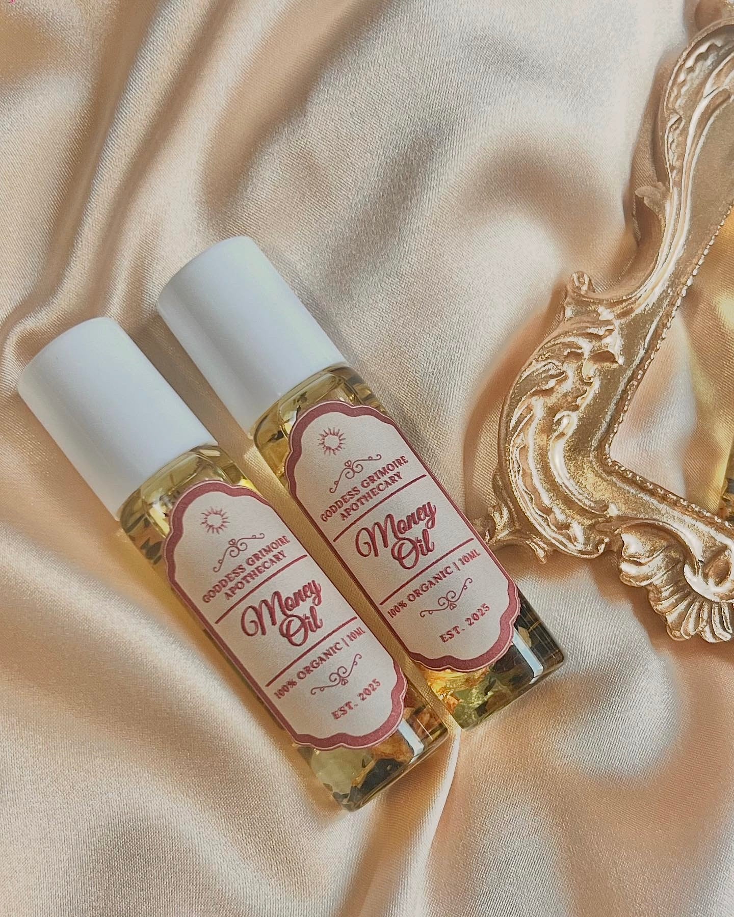 Manifest prosperity, luck, and abundance with our Money Oil, blessed by Goddess Fortuna herself. This enchanting blend is perfect for daily wear, inviting positive energy and wealth into your life with every drop. Crafted with a powerful mix of organic ingredients and charged with intention, this spell oil is designed to help you attract the abundance you deserve.