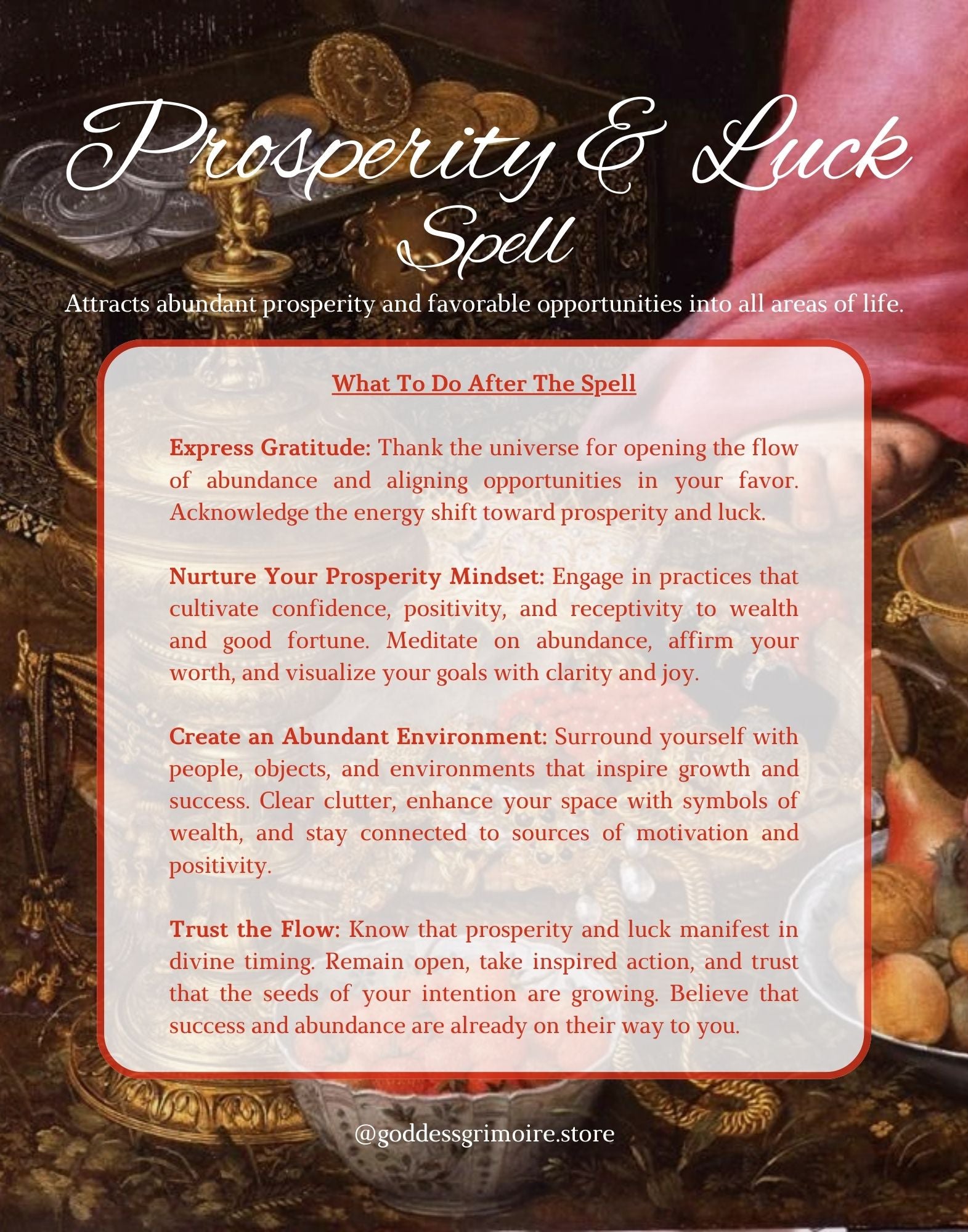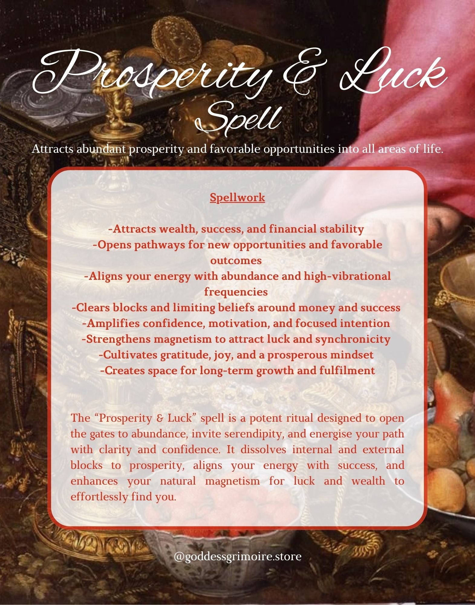 The “Prosperity and Luck” spell is a radiant ritual designed to attract abundance, good fortune, and aligned opportunities into your life. It clears energetic blockages that hinder success, opens the path for wealth and positive change, and empowers you to manifest your desires with clarity and confidence. This spell invites growth, luck, and prosperity in all forms - financial, spiritual, and emotional.