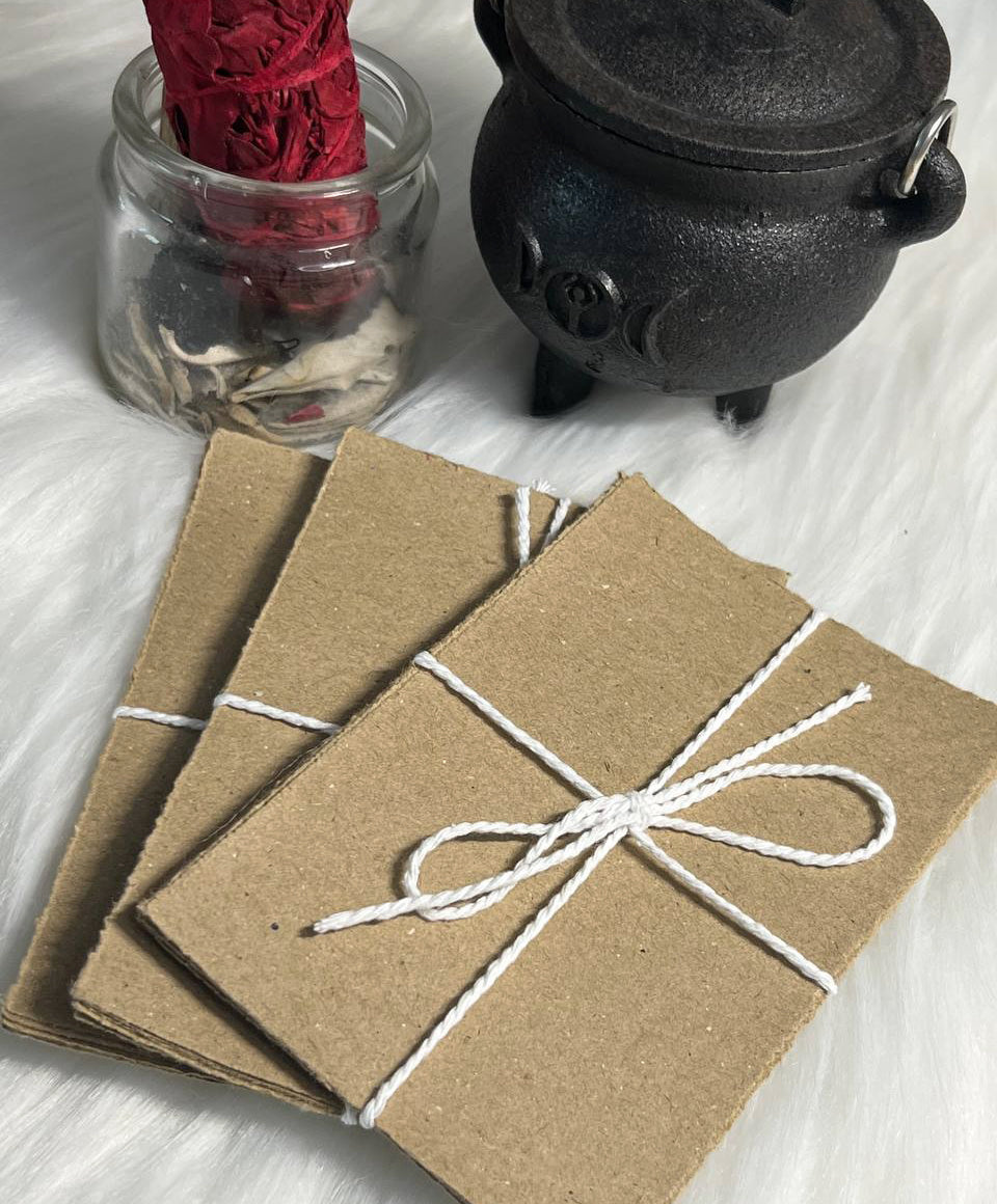 This set of Spell Paper is crafted from eco-friendly recycled craft paper, each sheet is infused with positive energy through a sage cleansing ritual, ensuring it’s charged and ready to hold your most powerful spells, wishes, or affirmations.