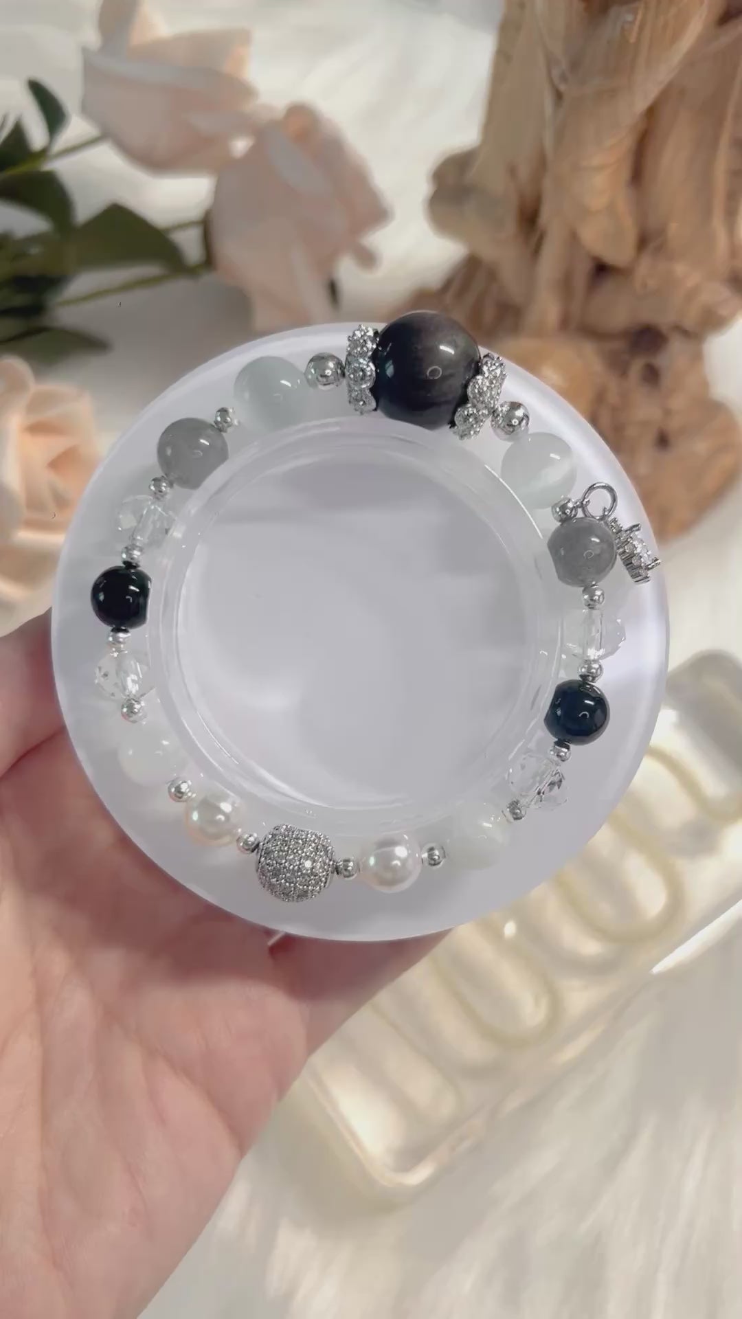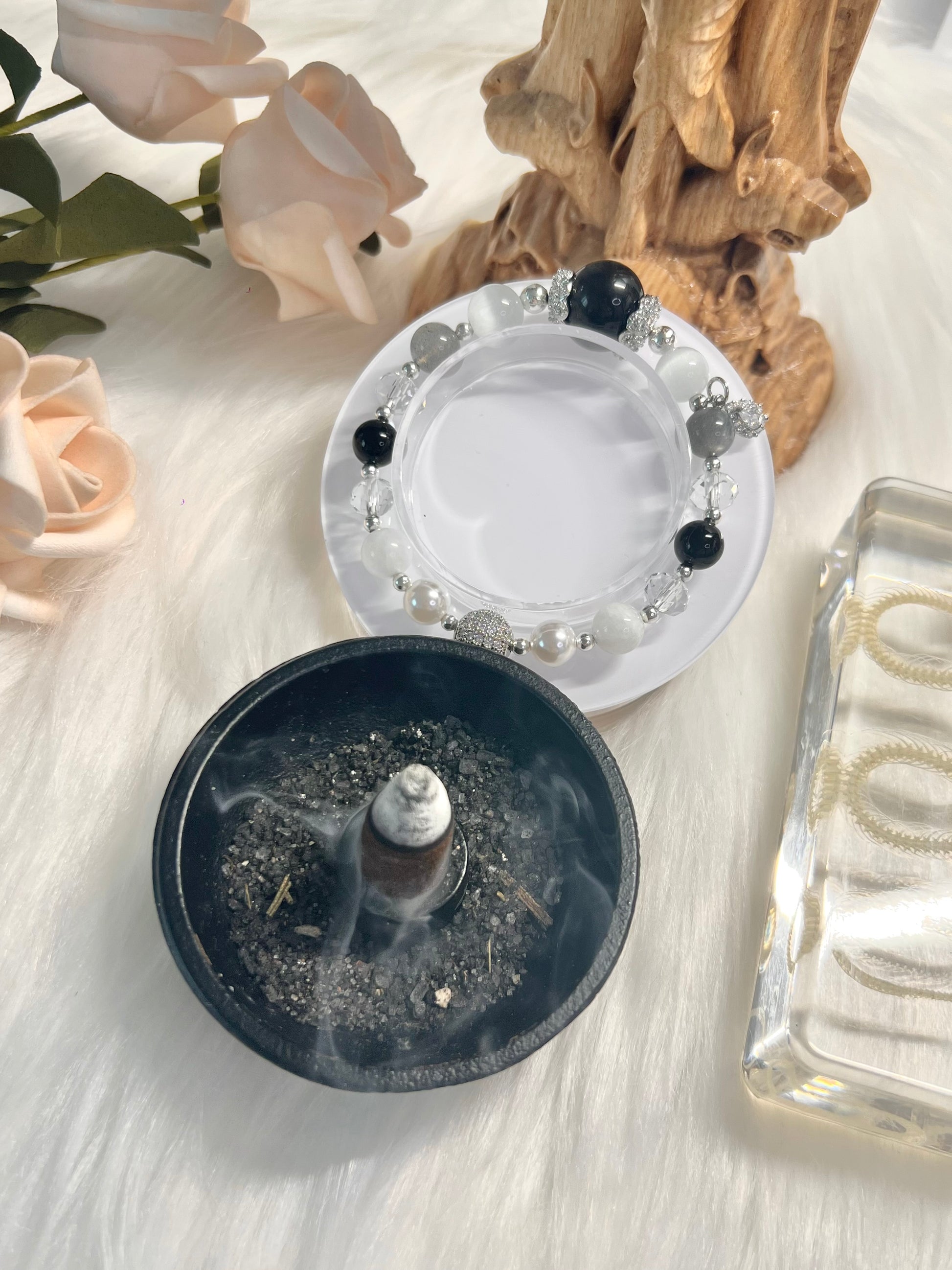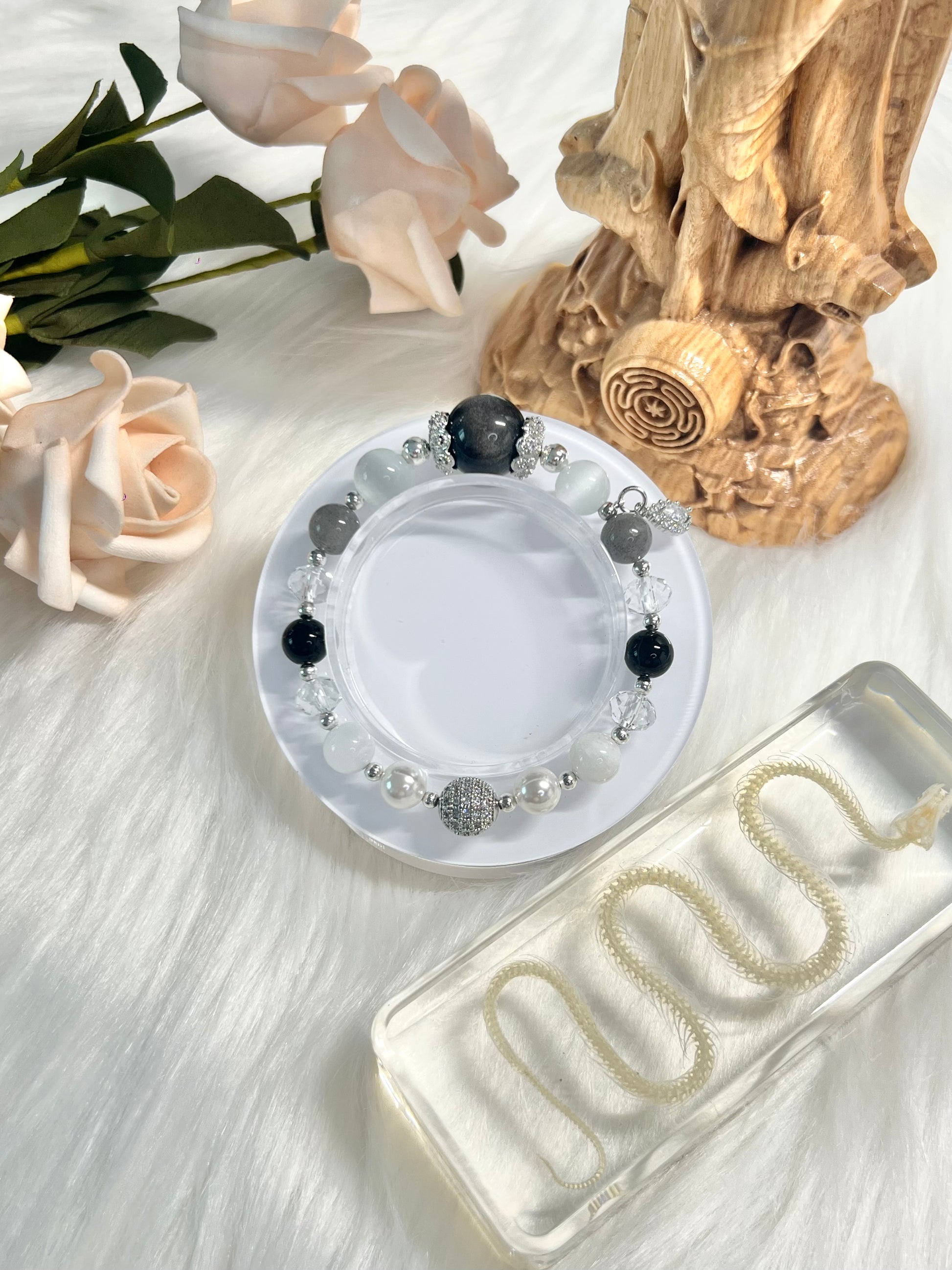 Crystals: Silver Sheen Obsidian, Selenite, Black Onyx, Gray Labradorite, Rainbow Moonstone, Clear Quartz, Fresh Pearls