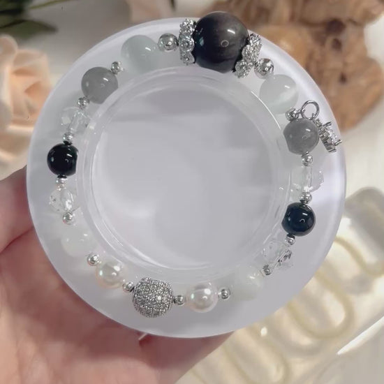 Spiritual Protection Bracelet - Silver Sheen Obsidian, Selenite, Black Onyx, Gray Labradorite, Rainbow Moonstone, Clear Quartz, Fresh Pearls
