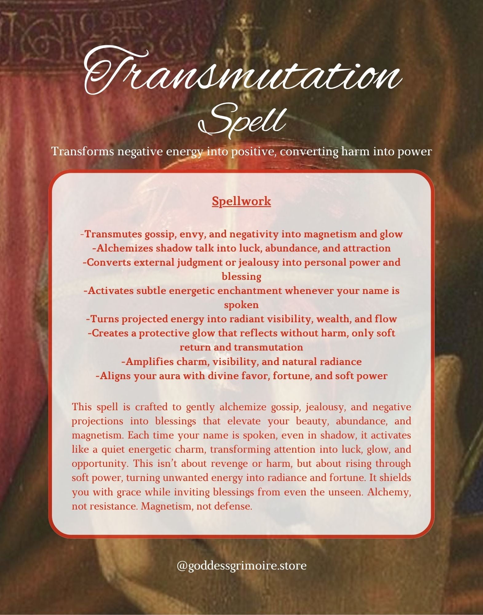 This spell is crafted to gently alchemize gossip, jealousy, and negative projections into blessings that elevate your beauty, abundance, and magnetism. Each time your name is spoken, even in shadow, it activates like a quiet energetic charm, transforming attention into luck, glow, and opportunity. This isn’t about revenge or harm, but about rising through soft power, turning unwanted energy into radiance and fortune. It shields you with grace while inviting blessings from even the unseen. Alchemy, not resistance. Magnetism, not defense.