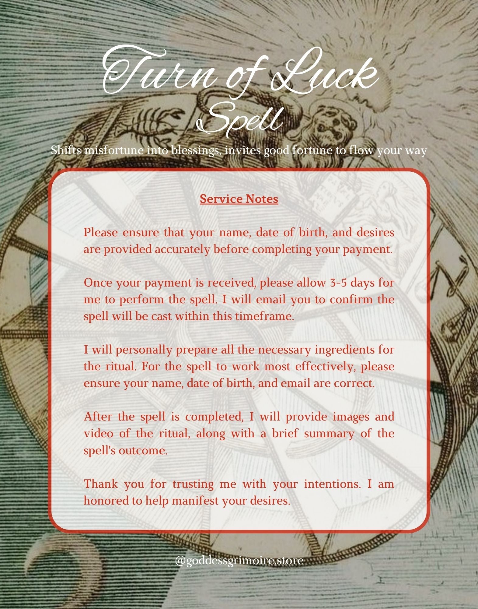 The Turn of Luck Spell is a powerful and uplifting ritual designed to shift your luck in a positive direction. It clears away lingering negativity, dissolves streaks of bad luck, and rebalances your energy so good fortune can flow freely into your life. This spell opens doors to new opportunities, blessings, and success while protecting you from future misfortune. Perfect for times when everything feels stuck or off-balance, it restores flow, confidence, and optimism, transforming challenges into opportunities and guiding your path toward brighter outcomes and lasting good luck.